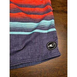Crafted from 100% polyester, these O'Neill board shorts feature vibrant blue and red stripes with an adjustable waist. Ideal for swimming or beach activities.