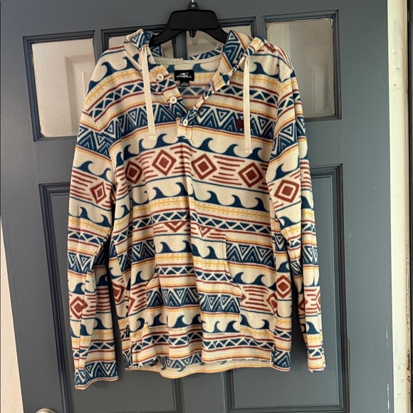 Stylish O'Neill sweater with a vibrant geometric pattern. Features a hood and button-up front. Perfect for casual wear.