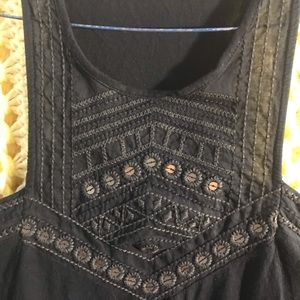 Classic black tank with fun geometric design, embroidered front, sequin accents with crew neckline & sharktooth hem. Worn once. Length approx 24”