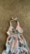 Vibrant cream and tan polka dot ruffled maxi dress with multicolor tropical flowers and stripes. Flattering nick tie halter top Perfect for a tropical getaway, luau, or summer fun.