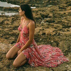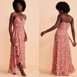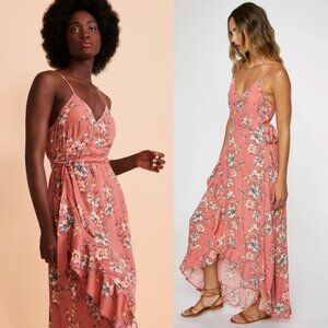 Beautiful O’Neill Viola High Low Maxi Wrap Dress in warm pink with tropical hibiscus print. High low construction with maxi length at the back. Adjustable spaghetti straps, adjustable wrap waist. Ruffle edge on the skirt. Lightweight and flowy, perfect summer staple. Very beautiful and flattering, always gets compliments, but it's just a little too small for me. Great used condition, no stains, no holes.