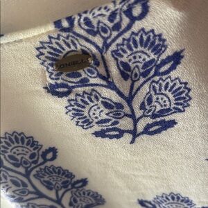Chic O'Neill kimono with blue patterns on white. Ideal for layering.