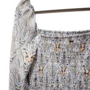 O'Neill Womens Blouse Smocked Square Neck Ballon Sleeves Baby Blue Paisley Print