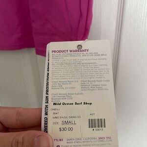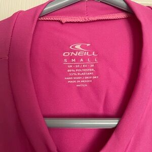 Add a pop of color with this fuchsia O'Neill tee. Ideal for swim wear. Wrinkles from storing. Lettering starting to age.