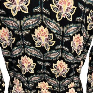 O'Neill Women's Lotus Black Floral LS Button Front/ Drawstring dress, size M. V neckline with button front, drawstring waist with tie. 3/4 sleeves, lined, small ruffle at bottom hem. 100% viscose, lining 100% cotton. Black background with colorful lotus flower design. Approximate measurements are pit to pit 19”, waist 17”, length from shoulder approximately 30”.