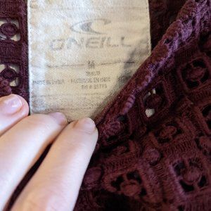 Cute and cozy O'Neill sweater. The top is open crochet and bottom is fleece. The back is slightly longer than the front so it's perfect with leggings. Good condition. Size medium.