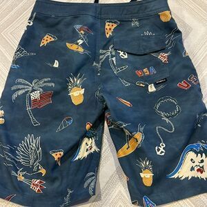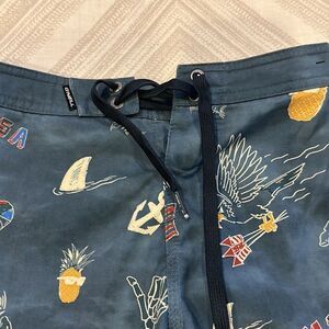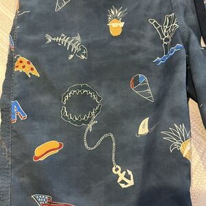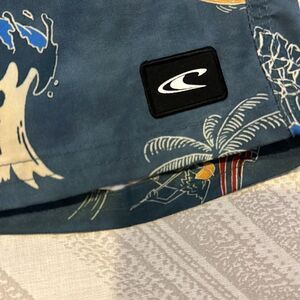 O’Neill Boys Blue Printed Bathing Suit Shorts. All sorts of designs on them. Tied and velcro closure. The color is a bluish grey. Made of polyester. Size is 23 which is equivalent to a M 10/12. Gently worn.