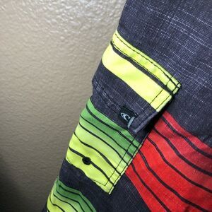 O’Neill Striped Boardshorts Size 29. Excellent condition. No signs of wear. Velcro fly with lace up. Side velcro pocket. Red black green yellow striped