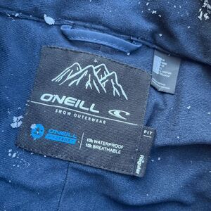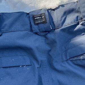 O'Neill Snow Outerwear waterproof snow pants in navy, size medium. Designed for ultimate performance, these pants feature O'Neill Hyperdry technology with 10k waterproof and 10k breathable ratings, ensuring maximum comfort on the slopes. The pants have zippered pockets, adjustable waist tabs for a customizable fit, reinforced leg cuffs, and inner gaiters to keep snow out. Made with durable materials, these pants have minor scuff marks and holes at the hems, consistent with light use. Perfect for skiing, snowboarding, or winter outdoor activities.