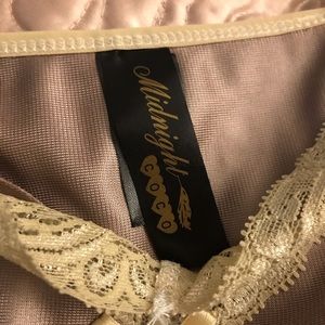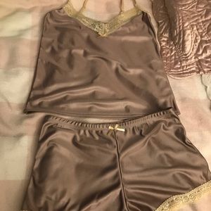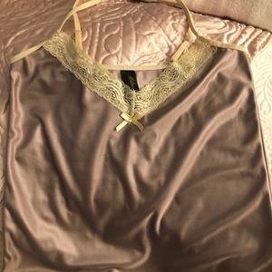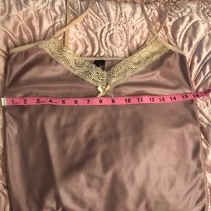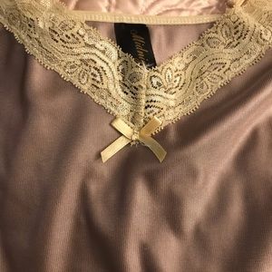 ๐NWOT ๐๐ผ๐ท๐๐ผ๐บ๐ป๐ แOแO โก๏ธ 2 Piece luxurious Loungerie Set. Gorgeous, silky, sumptuous set in a light Coco/Taupe shade with a (tad darker) Ivory lace trim. NO FLAWS AT ALL. Adjustable, well made straps that lie flat and donโt curl when on. I never wore this-its be kept carefully stored. So pretty! Shiny and very glossy- I wish it fit...my loss is your gain! Treat yourself- great deal! ๐