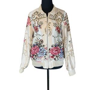 OO LALA Satin Floral Embroidered Bomber Jacket Beaded Medium Statement
