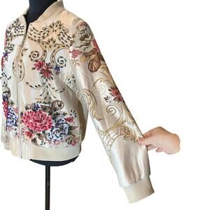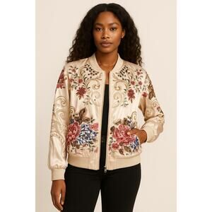 Stunning OO LALA bomber jacket in luxe champagne satin with intricate floral embroidery and beaded detailing. Features bold pink, red, and blue blooms with ornate scrollwork throughout, full zip front, ribbed trim, and silky pink lining. Medium weight with couture-inspired detailing — a true statement piece that elevates any outfit.