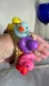 This is a large bangle bracelet with blinged out rubber ducks. The ducks are in the following colors-Blue, Purple, Pink, Red and the Yellow. All of the ducks have bling on their wings and each has a rhinestone necklace.