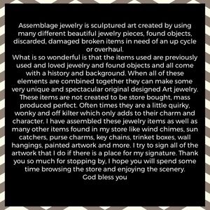 The intricate design is enhanced by sparkling elements to creating a harmonious blend of colors and textures making this assemblage piece a work of art. This is a one of a kind original piece of jewelry art. This would be an elegance and unique item to adorn any outfit.