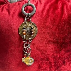This exquisite pendant necklace combo assemblage original art with steampunk flare features a captivating circular medallion disc pendant with dangling glass beads a masterful artisan creation of wearable art jewelry