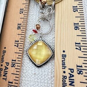 The colors are gold and silver with a silver toned chain 19’ total inches the piece purposely hangs long and regal.
