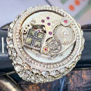 OOAK Custom Silver/Ruby/Diamond Watch Movement Assemblage Statement Ring 6.5
