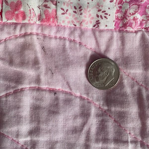 Hand stitched with a variety of patterned fabrics including a strawberry print, cows, sheep, mushrooms, florals, candy, cupcakes, tropical fish, dinosaurs, country homes, elephants and ducks.
