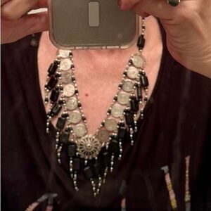 Beautiful necklace gives pop to a black top. Wear with a button down blouse to add some pizzazz to your work outfit.