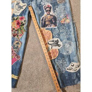 Several appliques have been added, parts from vintage fabrics, quilts and doilies. So, no one else will have one (these are similar to the patches I sew on my magnolia boho, Indie top hats). I have also created a patch with an inspirational quote: "Be unique, be beautiful, Be YOU!" Large floral appliques throughout. The photo style patches, I created. You will find, a dapper cat with a top hat, bird, Frida, several Gypsies, two retro cats, and an eyeball. The jeans have been sewn back together with double stitching to make them extra durable. They have been bleached and are distressed by design. All edges are raw and will fray more over time (just trim as needed). Many, many hours of slow stitch embroidery are on the front and back, around the pockets, appliques and trim. You can also find it around patches and outlining quote. Last but not least, screen print ink has been used to print a boho pattern, in white, on both the front and back.