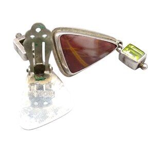 OOAK Obsidian Sterling Stone Earrings with Peridot Dangle, Vintage Mauve Natural Stone Clip Ons in Sterling Silver