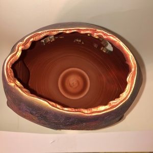 This gorgeous iridescent brown, copper, and green-based decorative pottery is THE coolest show stopper for your home. It's perfect to be displayed on a mantel, shelf, or table, and can hold its own as the focal point of the room's decor. It features unique cut-outs, texture, and shaping, and evokes visions of the southwest. It measures about 16 inches from table to highest point, and about 10.5 inches across. The pot is in perfect condition and is brand new with tags. Is not made to hold water.