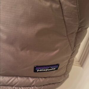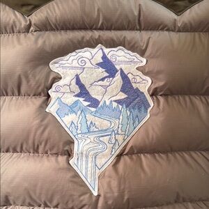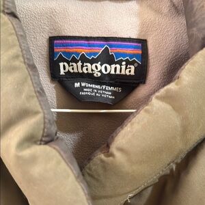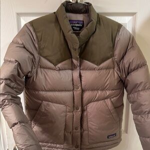 Stylish one of a kind Patagonia puffer jacket in two-tone brown and olive. Perfect for cold weather. Mountain decal patch sewed into back, one of a kind! In excellent condition.outdoors camping hiking