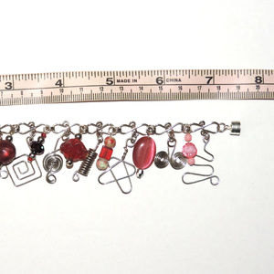 Nineteen handcrafted charms in shades of red, pink, and silver silver dangle from handcrafted silver-tone links.