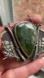 This piece features a beautiful vesuvianite cabochon and ornate Lily of the Valley sterling silver details paired with scythes.