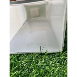 Plain white in back. No drainage hole. Can be used as a planter, utensils holder, you name it!