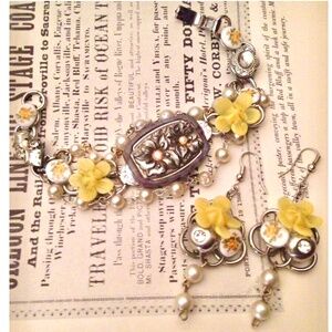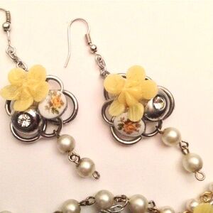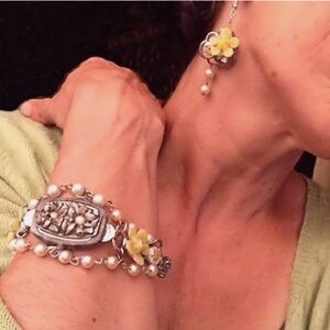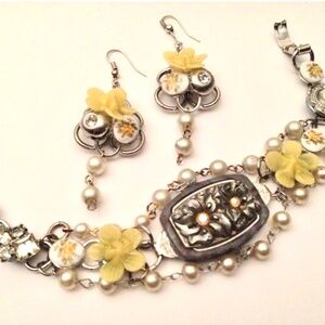 OOAK Vintage Victorian Nouveau Bracelet Earrings Set *Yellow Floral/Silver/Pearl