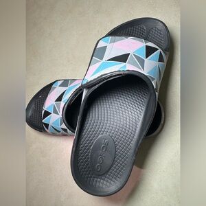 OOFOS Geometric Slide Sandals in Black, Blue, and Pink Sz-9W Pre -owned