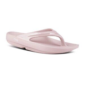 The OOFOS OOlala Stardust Women’s Sandals in size 5 (US) or 36 (EU) feature a slip-on closure and a pink color with logo accents. Made with patented foam lining, insole, and outsole materials, these lightweight, cushioned sandals provide arch support, slip resistance, and waterproof properties. Ideal for all seasons, these stylish thong sandals also have orthopedic features for added comfort, making them a limited edition release from the OOFOS brand. Perfect for casual wear and everyday use.