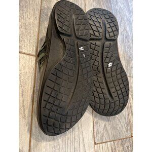 OOFOS Ooclog Shoes Clogs Slip On Green Camoflauge size 8 Mens, 10 Womens Recovery Mules in Jungle pattern is Unisex. EU 41. Made in Vietnam. Heel measures 1.25". Slip on shoes for river trail comfort walking professional nursing hunting garden. The upper right shoe is slightly squished as pictured. The shoe isn't damaged but worth mentioning. I haven't tried to clean these shoes but they really aren't that dirty with normal wear / dirt as pictured. Slip on sandals for men and women makes a great gift for the outdoors.