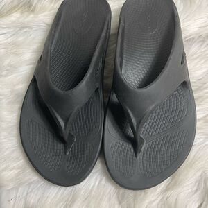 OOFOS Unisex Black Rubber slip on thong sandals Men SZ12 Women SZ14 .pre owned in good used condition normal wear see all pictures any questions please message.B13