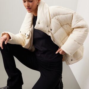 Stylish cream puffer jacket with a high collar. Perfect for cold weather.