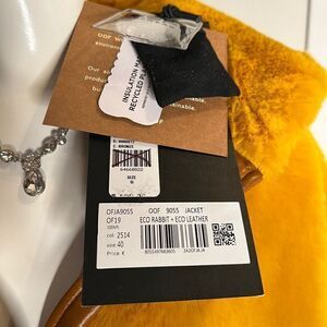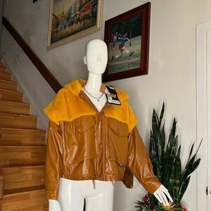 Luxurious short bomber jacket with hood, a mix of faux fur and faux leather. Covered snap fasteners down front, large front patch pockets, adjustable bottom drawstring. Very warm, quilted interior with REPREVE fake down, 100% Recycled and 100% Animal Friendly.