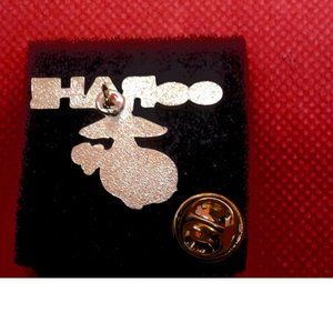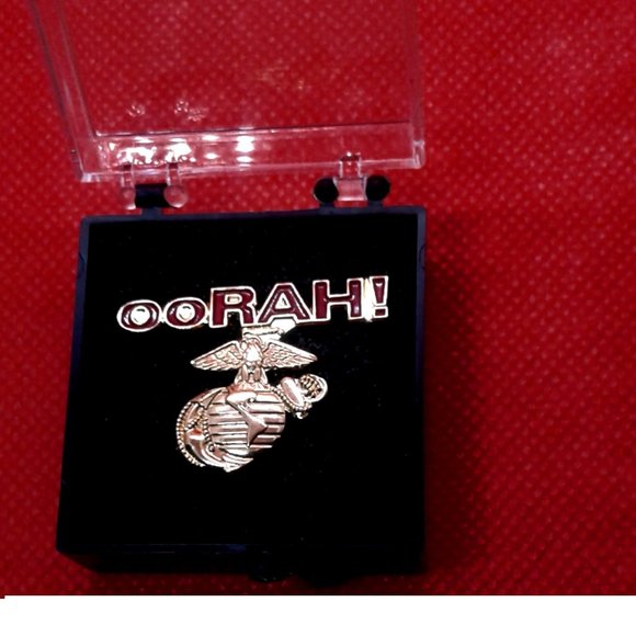 Marine Corps lapel/hat pin with "Oorah" and the marine corps globe insignia with a clutch back fastener.