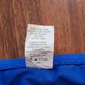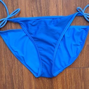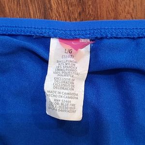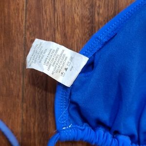 Blue Womens Junior OP Bikini set. Triangle bikini top with removable padding. Ties at the neck and back. Side tie bikini bottoms. Top and bottoms are size L(11-13). In excellent condition, gently used with no stains or tears. Beautiful color, perfect for this Summer. I am just trying to declutter. Thank you!