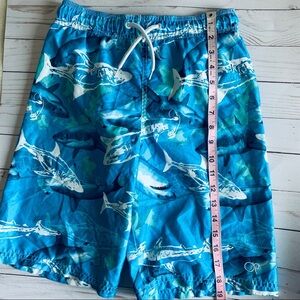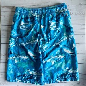 Boys Shark swim trunks in blue and white colors, elastic waistband with functional drawstrings, mesh lining.