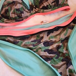OP camo swimsuit. Good used shape, no holes or tears. Elastic seems good in both pieces. Bottoms are a large and top is a medium! I did notice some black lines on the inside of the suit I'd say it's where it's sat. It may wash out:) Any questions feel free to ask. Thank you
