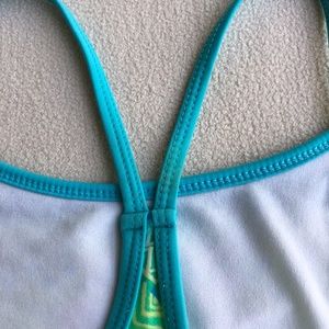 Tropical patterned one-piece with turquoise trim at the neckline that continues as racerback straps.