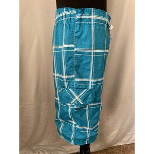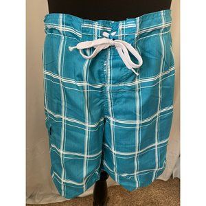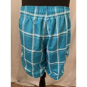 OP Men's Teal/White Checkered Swim Trunks. Size Medium (33-34) measures: 34” waist, 22“ (44“D) hip, 12.5“ rise, 10.5“ inseam. Preowned, Better than normal wear. No discoloration, fading, stains, rips or holes. Clean, smoke-free home.