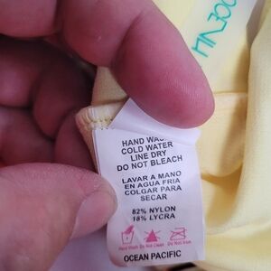 Ocean Pacific Cutout One Piece Swimsuit. Women's size large. Suit has a back closure with gold tone harware. Has a cute tie detail in front. Pale yellow and pink. There is removeable padding. In great preowned condition.