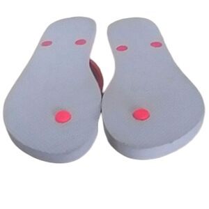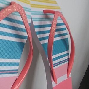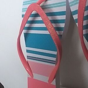 OP pink, blue, and bright yellow striped summery flip flops with glittery pink thongs. They are like new with no signs of wear or flaws. There is no size marked on the flops but they fit a women's size 9-10. In excellent like new condition with no flaws.
