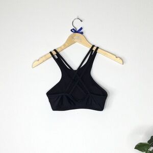 A high neck bikini top with multi colored woven details. Padded. Not adjustable.