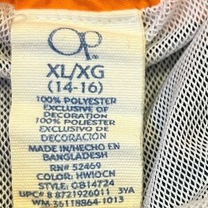 Boys lined swim trunks/board shorts, by OP. Trunks are blue with orange accents, and have a drawstring waist. The pocket on the right leg has the OP logo and can be fastened, as shown in photo. Boys size XL (14-16).