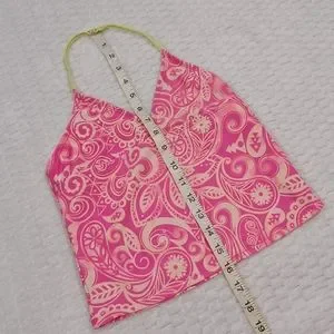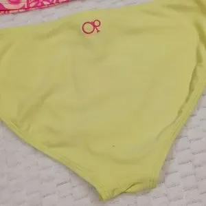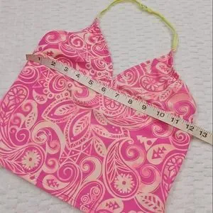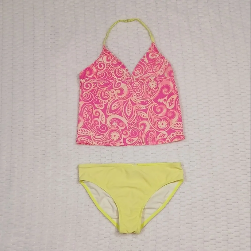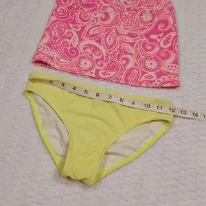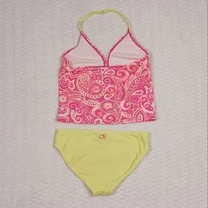 Size M (7/8) OP tankini. "Astro Yellow" paisley design on neon pink top with astro yellow bottoms. 82% nylon 18% spandex. Please see pics for measurements and condition. There is a small stain on the front of the top and a dot on the rear, as well as some pilling and general wear from sitting around the pool. These can be seen in the pictures. In pre-owned condition.