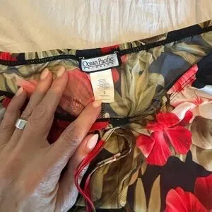 Tropical sheer floral pants by OP. Features bold red flowers and lush green leaves. Perfect cover up bottoms for the beach or the pool.