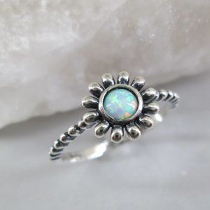 925 sterling silver dainty flower ring. This one is so cute...and has a beautiful OPAL stone at its center. Beautiful design. Oxidized sterling accents. Well made. Face height = 9mm. Stamped 925. Various sizes in dropdown.